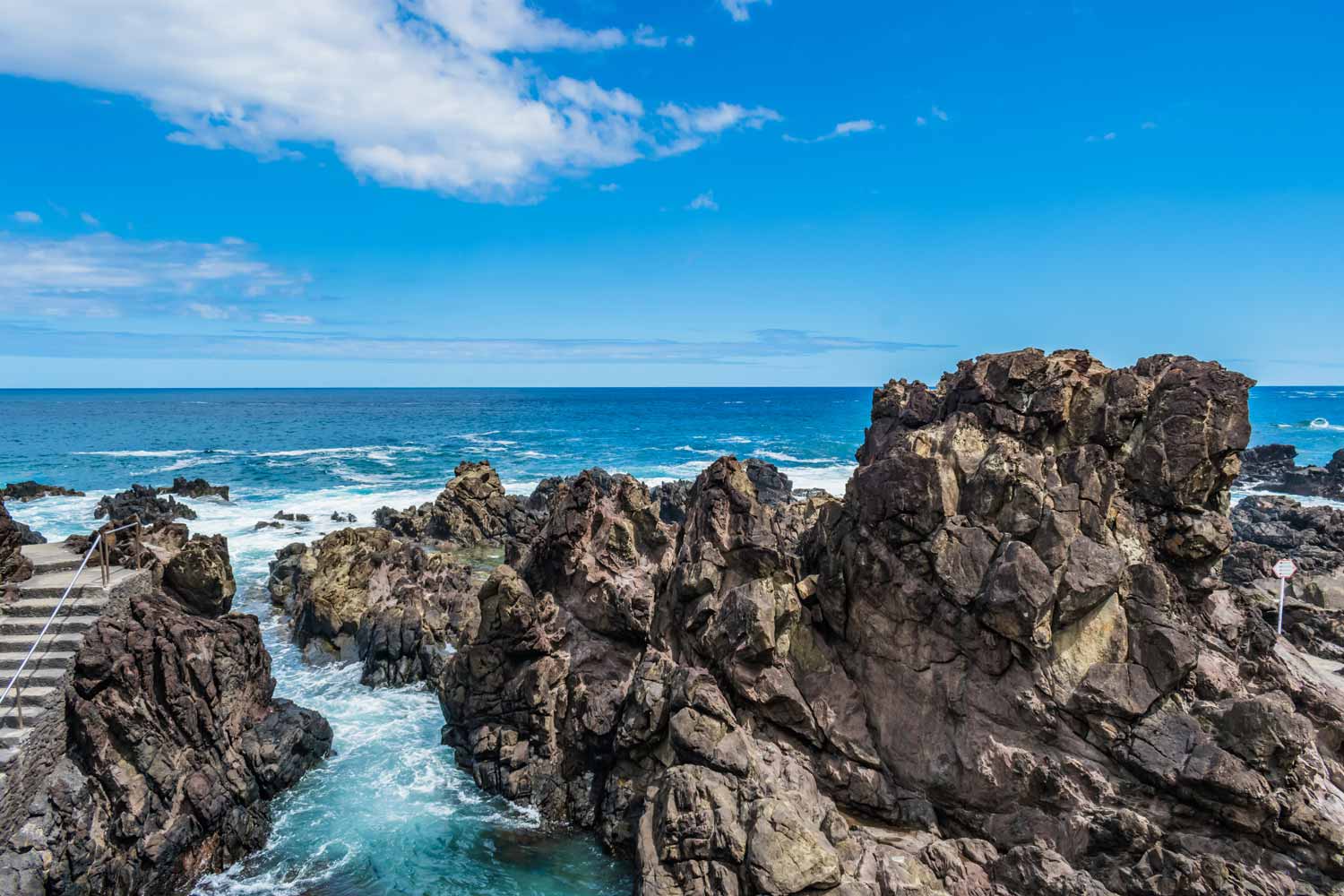 A água é cristalina e a paisagem é marcante: rocha negra vulcânica contra o azul intenso do Atlântico. Nos dias de maré alta, as ondas rebentam nas rochas e renovam a água das piscinas. Nos dias calmos, as poças mais abrigadas são perfeitas para famílias com crianças. A zona tem Bandeira Azul e está equipada com balneários, chuveiros, bar e estacionamento gratuito. Durante a época balnear (15 de junho a 30 de setembro), há vigilância por nadadores-salvadores.